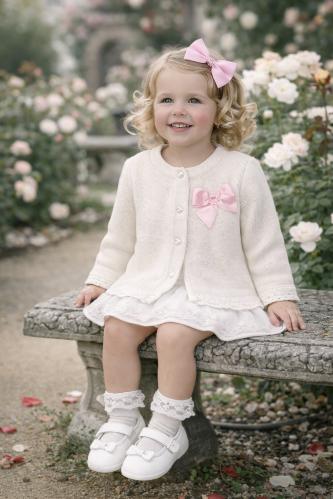 white and pink bow cardigan